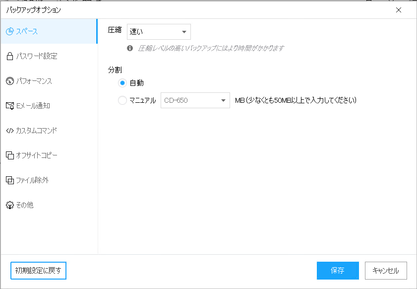 ⇒バックアップファイル(イメージファイル)の圧縮や分割を設定する箇所