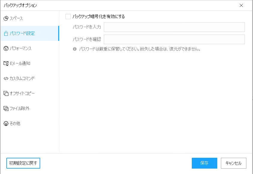 ⇒バックアップファイル(イメージファイル)にパスワードを付与する設定箇所
