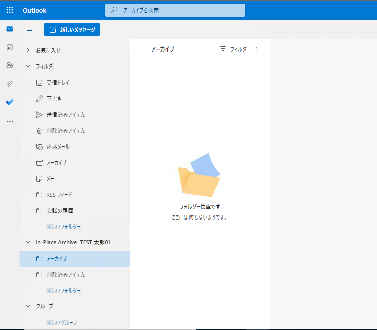 有効化するとWeb版だと「In-Place Archive〜」、Outlookアプリだと「オンラインアーカイブ〜」というのが表示されるようになったのがわかります。
