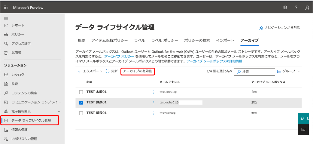 「データライフサイクル管理」-「アーカイブ」より対象ユーザーにチェックを入れて「アーカイブの有効化」から設定します。